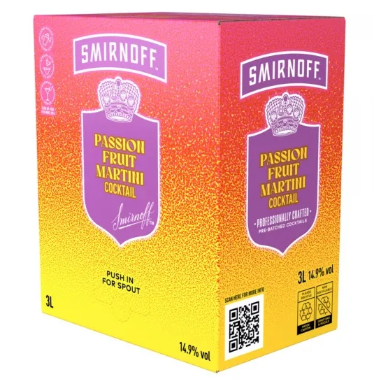 Introducing the professionally crafted pre-batched Smirnoff Passionfruit Martini cocktail. The nations favourite cocktail created using Smirnoff Vodka combined with juicy passion fruit and citrusy lime flavours, balanced with smooth notes of vanilla and marshmallow. Now readily available in an easily decanted format to help with quick service high-volume cocktail orders. Simply pour 150ml into a cocktail shaker over ice, shake for 10 seconds and strain into a chilled martini/ coupe glass. Garnish with half a passionfruit.